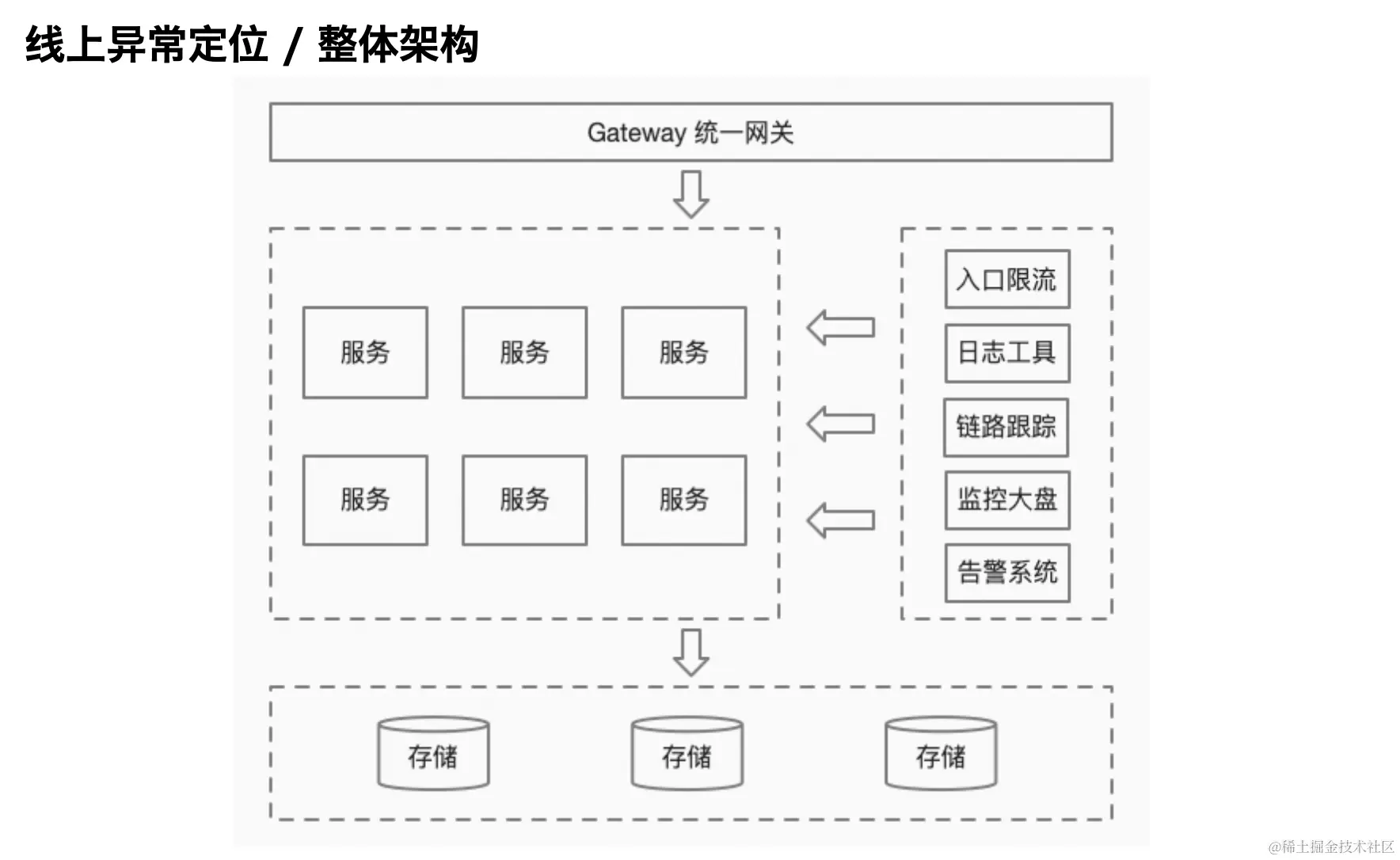 总结一下,在线异常定位需要一些关键服务和架构组件。首先,我们需要入口限流服务,以处理大流量情况。其次,日志工具链路跟踪是必要的,以便跟踪错误日志并了解服务之间的调用关系。最后,监控大盘和告警系统是早期干预的关键,我们需要了解服务的基本信息并建立警报机制。这些服务一起维护了整体服务的稳定性。
