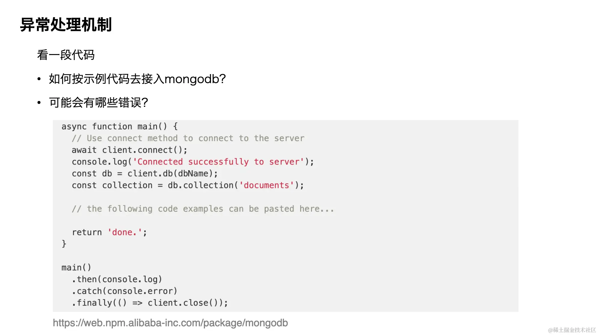 然后我们来看一个实际案例,以了解如何根据示例代码连接 MongoDB。我在 NPM 上找到了一段示例代码,通常这些示例代码都非常简洁,只包含主要的代码结构,而对于错误处理通常没有详细说明。