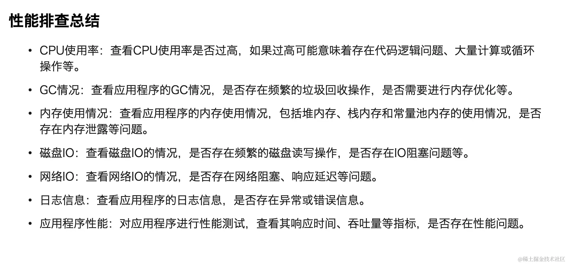 例如,对于 CPU 使用率,我们可以检查是否存在代码逻辑问题;对于 GC 情况,我们可以查看是否频繁进行垃圾回收操作;对于内存使用情况,我们可以分析内存泄漏情况;对于 IO、网络和日志信息,我们可以检查是否出现问题;对于应用程序性能,我们可以进行性能测试,检查接口响应时间和吞吐量是否正常。通常,在大型促销活动之前,我们会进行压力测试,以确保接口性能没有问题。