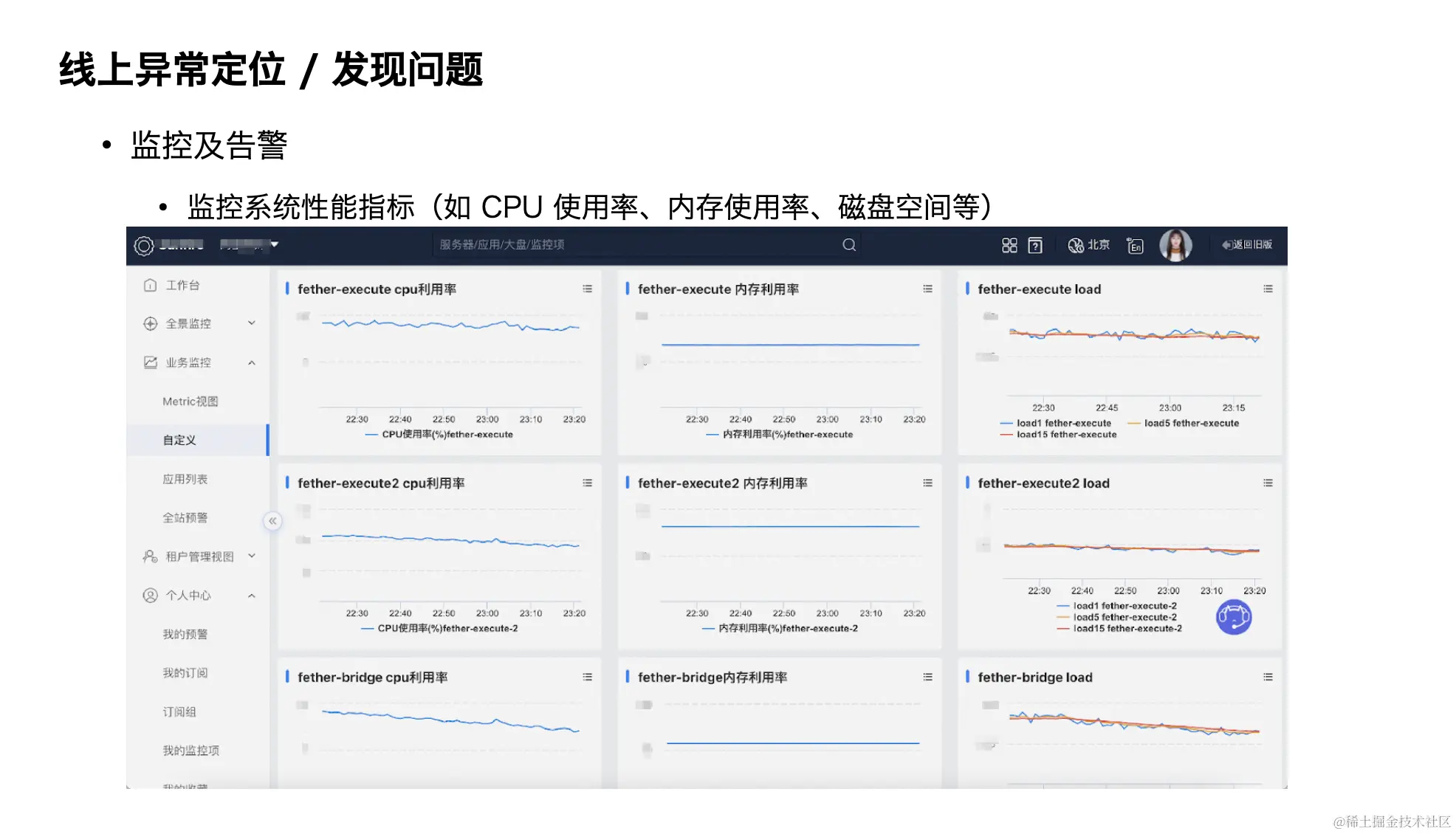 在问题的发现阶段,我们需要一些告警机制,包括监控系统的性能指标,如 CPU 使用率、内存使用率、磁盘空间等等。我们需要确保系统处于健康状态。