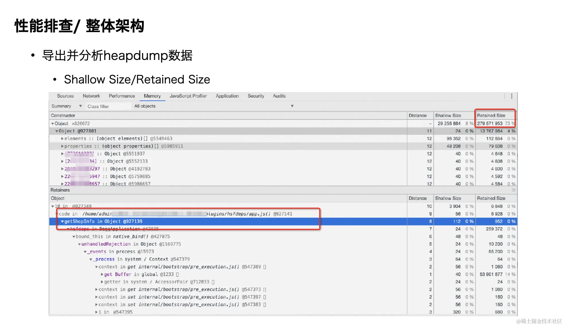 在分析 heapdump 数据时,我们发现"Retainde Size"非常大。在这里需要理解两个概念,即"Shallow Size"和"Retainde Size"。"Shallow Size"是V8堆在对象自身创建时分配的大小,而"Retainde Size"表示对象在从堆中移除后、并在进行 Full GC 后释放的空间大小。通常在内存泄漏情况下,"Retainde Size"会非常大。我们进一步深入查看后,确实发现了问题,甚至具体的代码位置都提示了出来。