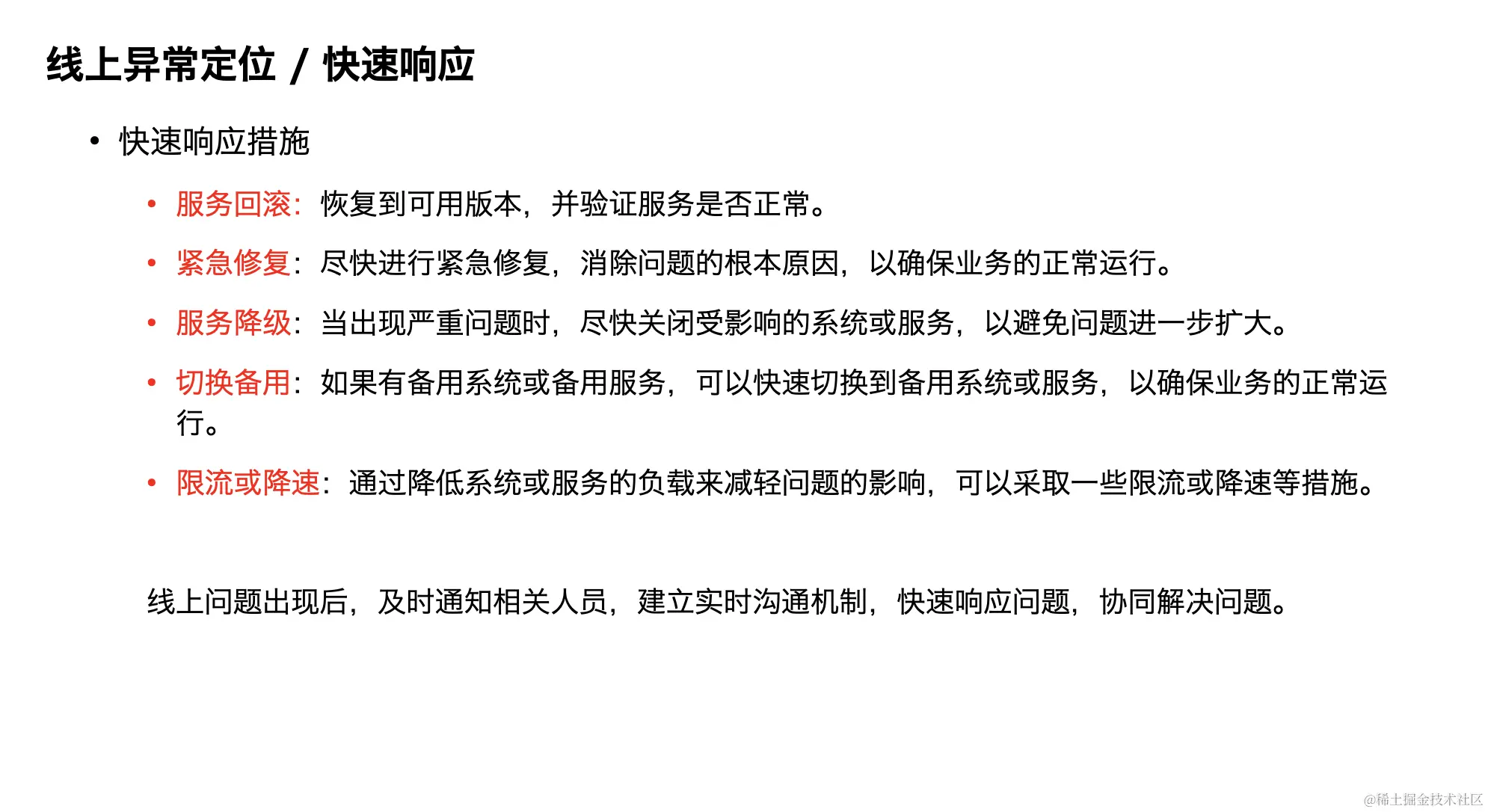 - 快速响应,一旦问题被发现,需要快速响应,即使此时我们可能还不了解问题的原因,但需要先解决问题,可以进行回滚或快速修复。