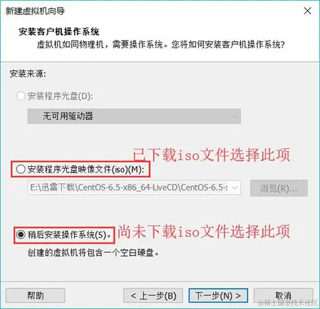 点击“下一步”,进入“安装操作系统”界面,若初学者已提前准备好 Linux 系统的映像文件(.iso 文件),此处可选择“安装程序光盘映像文件”,并通过“浏览”按钮找到要安装 Linux 系统的 iso 文件;否则选择“稍后安装操作系统”。