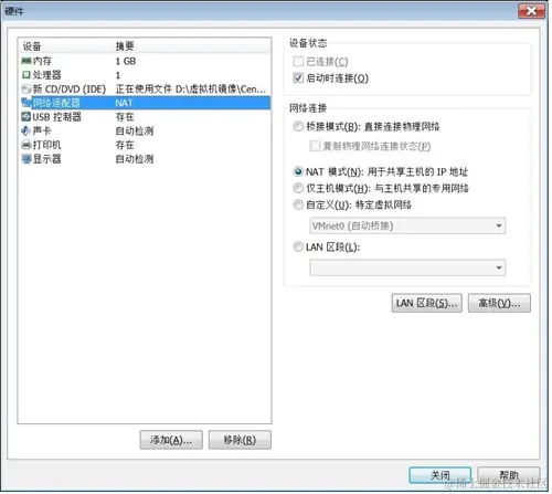 - LAN 区段:这是新版 VMware 新增的功能,类似于交换机中的 VLAN(虚拟局域网),可以在多台虚拟机中划分不同的虚拟网络。