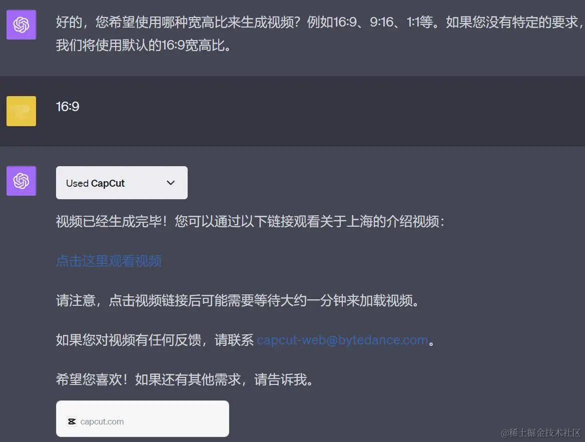 GPT-4 则是调用 CapCut(字节的剪映)插件生成视频内容。需要注意的是,它提示要想生成视频,就必须要与你进行多轮对话,逐步确定好视频脚本(英文的)、屏幕比例等等: