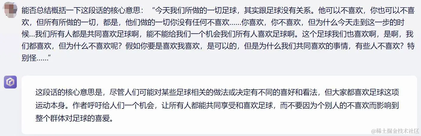 两个大模型都认为说话人想表达的是:人们都喜爱足球这项运动,不应该因为一小部分人的不喜欢而影响到这种喜爱。不过作为人类,还是得说一句 AI 没有理解「想说声喜爱很难」这种感情。