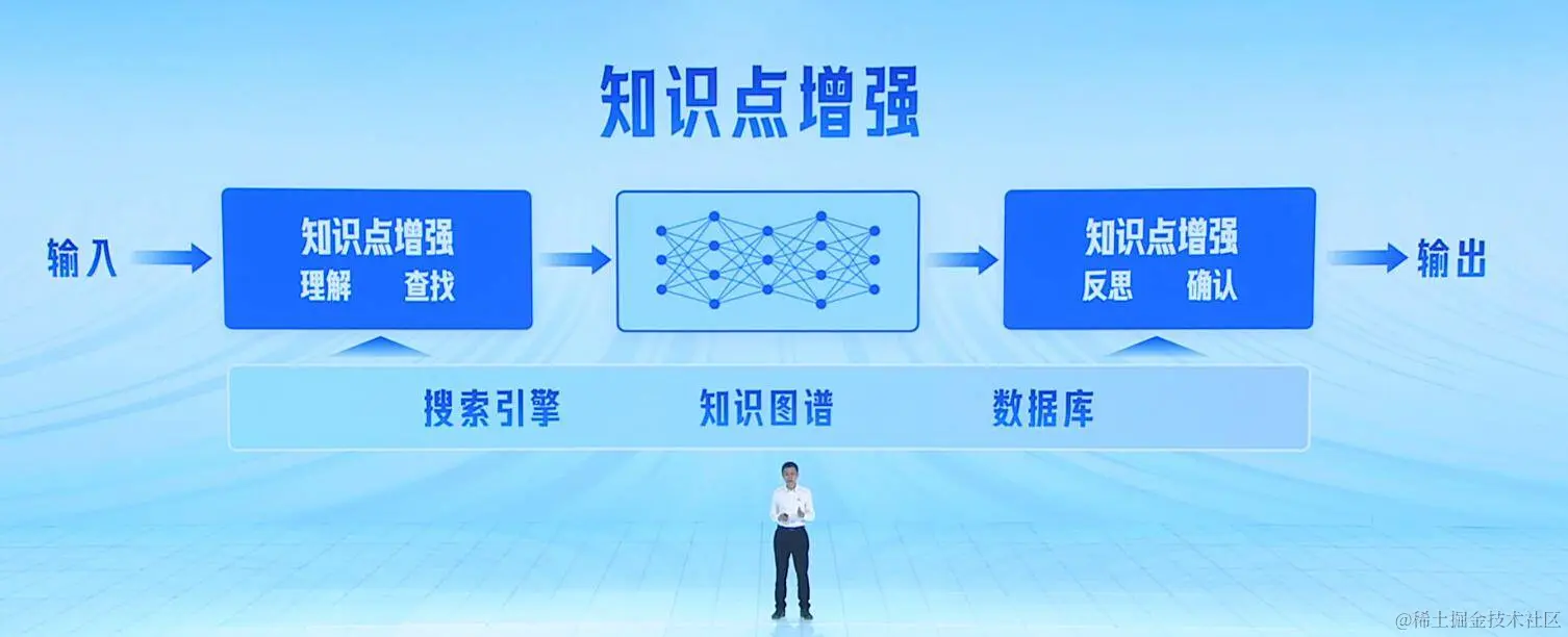 文心大模型 4.0 实现了输入和输出两阶段的知识点增强,一方面对用户输入的问题进行理解,拆解出所需的知识点,然后在搜索引擎、知识图谱、数据库中查找准确知识,再把这些知识组装进 Prompt 送入大模型,提升了准确率和效率。另一方面又对大模型的输出进行「反思」,从生成结果中拆解出知识点,再用搜索引擎、知识图谱、数据库,以及大模型本身进行确认,对有差错的内容进行修正。