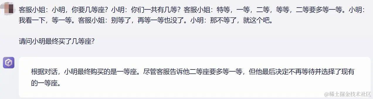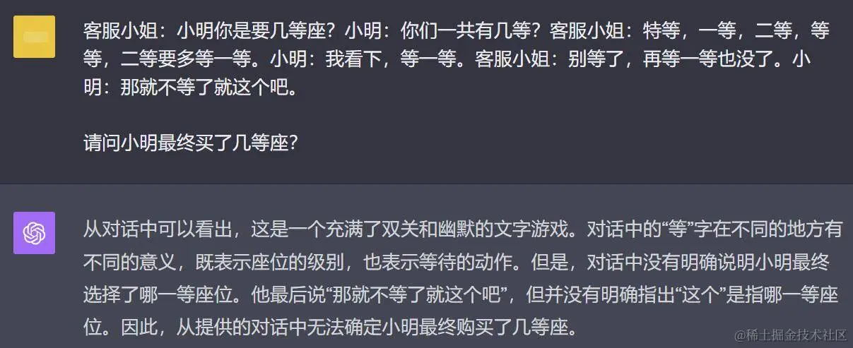 换业界标杆 GPT-4 来回答,它理解并解释了其中幽默的意味,但表示无法确定小明最后买的是几等座: