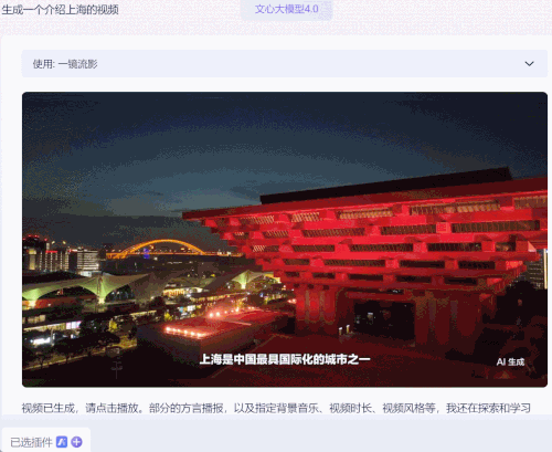 还有多模态生成,我们直接用同样的指令让两个大模型生成一段视频,文心一言调用「一镜留影」插件,直接输出了结果: