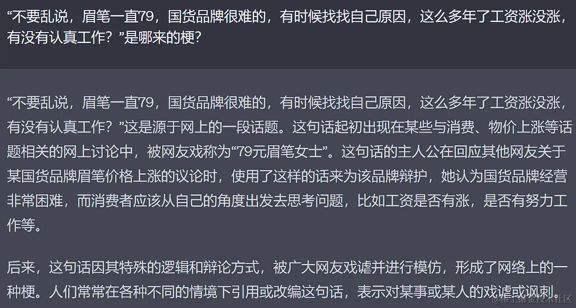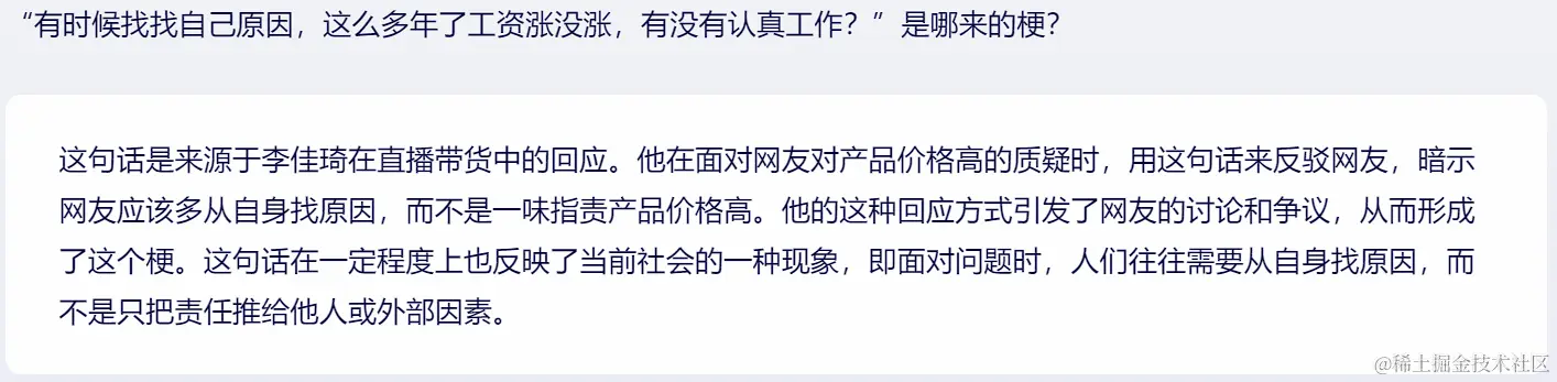 另外,文心一言目前为保证获取实时信息,默认接入了百度搜索插件,也在理解网络新趋势的时候能帮得上忙。比如,我们最近都在反思自己有没有努力工作: