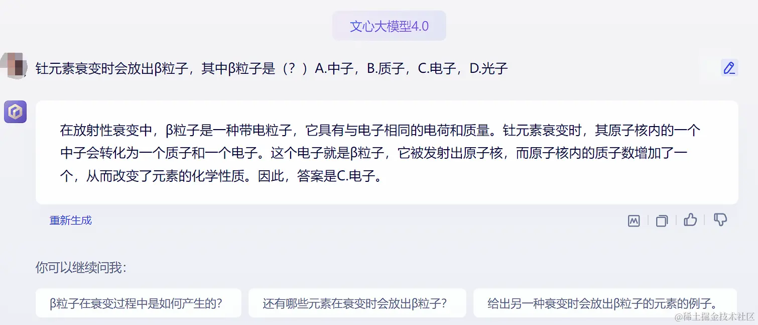 看起来文心能给出的答案更详细一些,另外还显示了几个进一步解释概念的引导选项,似乎它对做题进行了专门的优化?