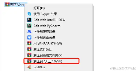 1.通过文章末尾处下载软件后,选中下载的【天正7.0】压缩包,右击选择解压到【天正7.0】。
