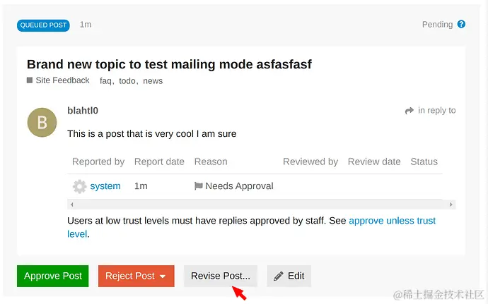 感觉这个功能可能不会经常使用,很多社区对帖子的审核是非常宽松的,只要不是毫无意义的内容,这个审核功能通常没有使用。