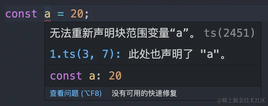 例如我们在在一个 TypeScript 工程下建立一个文件 1.ts,声明一个变量a,如下: