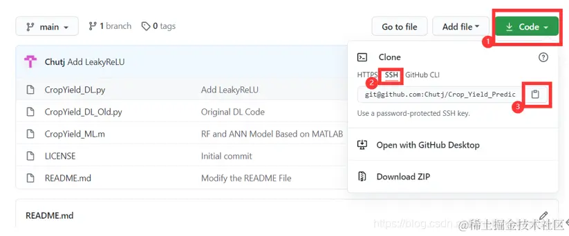 随后,在Repositories界面左上角的Code界面,依据下图依次选择,并复制对应的SSH备用。