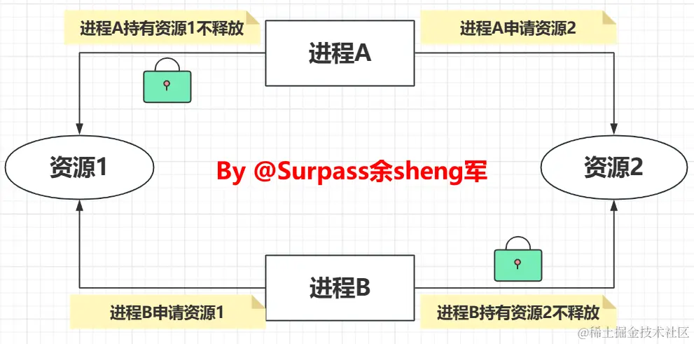 - 简单来说,死锁产生的原因就是自己不释放资源还羡慕着别人的资源。