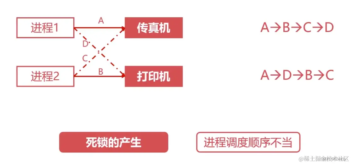 死锁:两个或两个以上的进程在执行过程中,由于竞争资源或者由于彼此通信而造成的一种阻塞的现象,若无外力作用,它们都将无法推进下去。永远在互相等待的进程称为死锁进程。