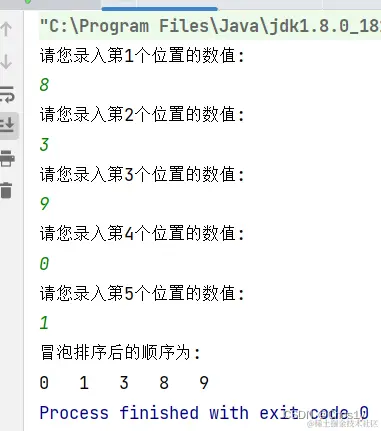public static void main(String[] args) { /* 冒泡排序的实现步骤: 1.定义一个外部循环控制总共需要冒几轮(数组的长度-1) 2.定义一个内部循环控制每轮依次往后比较几个位置/每轮比较的次数(数组的长度-当前的轮数) 3.如果当前位置的元素值大于后一个位置的元素值,两者交换 */ // 1.动态初始化数组 int[] datas = new int[5]; // 2.键盘录入一组数字 Scanner sc = new Scanner(System.in); for (int i = 0; i < datas.length; i++) { System.out.println("请您录入第" + (i + 1) + "个位置的数值:"); datas[i] = sc.nextInt(); } // 3.冒泡排序的实现 // datas = [3,5,6,8] // i = 0 第一轮 0 1 2 // i = 1 第二轮 0 1 // i = 2 第三轮 0 // 定义一个外部循环控制总共需要冒几轮(数组的长度-1) for (int i = 0; i < datas.length - 1; i++) { // 定义一个内部循环控制每轮往后比较几个位置/定义一个内部循环控制每轮比较的次数(数组的长度-当前比较的轮数) for (int j = 0; j < datas.length - i - 1; j++) { // 如果当前位置的元素值大于后一个位置的元素值,两者互换 if (datas[j] > datas[j + 1]) { int temp = datas[j + 1]; datas[j + 1] = datas[j]; datas[j] = temp; } } } // 遍历数组输出 System.out.println("冒泡排序后的顺序为:"); for (int i = 0; i < datas.length; i++) { System.out.print(datas[i] + "\t"); } }
