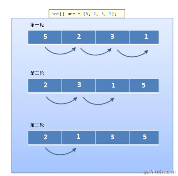 - 从头开始两两比较,把较大的元素与较小的元素进行互换