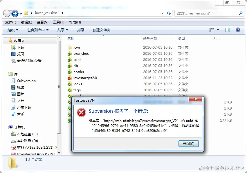 ****今天在snv根目录下重新定位上传的url,更改后出现如下错误 。可以看到,原来Repository创建者的uuid是前者,而现在我操作的是后者的uuid.因此,目前的操作办法是