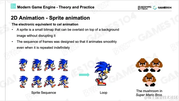 这里特别要讲到Super Mario,记得我在第一节课讲过那个时代做游戏不需要游戏引擎,他们真的非常聪明,比如像这只小蘑菇,实际上就是一张图,把它flipping后不断播放,你就感觉到一个小家伙瞪着眼睛向你走过来。所以那个时候真的资源很少,大家做东西还是非常具有想象力的。