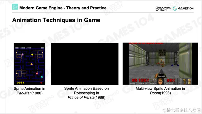 Games 104关注的是游戏引擎,接下来介绍游戏动画,游戏动画的鼻祖依然是电影行业。最早期的动画非常简单,不断翻转、播放图片。波斯王子游戏中的角色看起来非常自然、灵活,但实际上也是通过图片制作出来的。为了制作出逼真的动画,制作者拍摄了波斯王子的弟弟,让其模仿动画中需要的动作,并根据照片将动作绘制出来,成为了游戏中的像素。在那个时代,波斯王子中角色的动作非常自然。即使是基于骨骼的3D动画技术,我们追求的自然感仍来自于真实的人类,而人类对这种自然的真实感非常敏感。另一个需要highlight的游戏是Doom,它看起来是3D游戏,但实际上是通过2D动画实现的。游戏中墙体带给玩家的空间感,是通过图片的变形实现的;而游戏中的开枪动作等,是通过当前相机角度配合一组图片实现的,让玩家感觉自己身处3D环境中,Doom也是游戏动画的鼻祖之一。