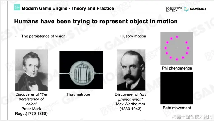 直到近代,人类发现一个非常有意思的现象,就是著名的“视觉残留”现象,这也是现代所有显示设备的一个理论基础。当我们看到一个物体,这个物体的影像在眼睛中会残留大概1/24秒。而这是所有电影、电视,包括游戏以及游戏动画的一个基础的理论支撑。因为我们没有办法真正实现自然界中那种连续不断、可以无限细分的动画系统。