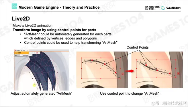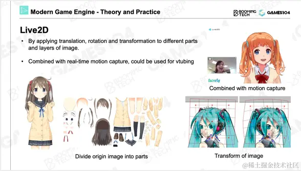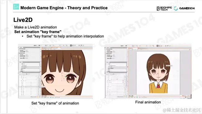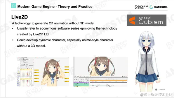 但真正的游戏,也就是大家经常氪金的游戏,实际上使用了一种更加高端的2D动画技术,就是这里要着重介绍的Live 2D。我个人还是蛮喜欢这个技术体系的,非常简单,但给艺术家的空间特别大。右侧二次元角色非常鲜活,她就是用一系列图片通过变形、编辑得到的。如果想制作卡牌游戏、二次元游戏,但预算、时间有限,这一部分将是你们最关注的东西了。