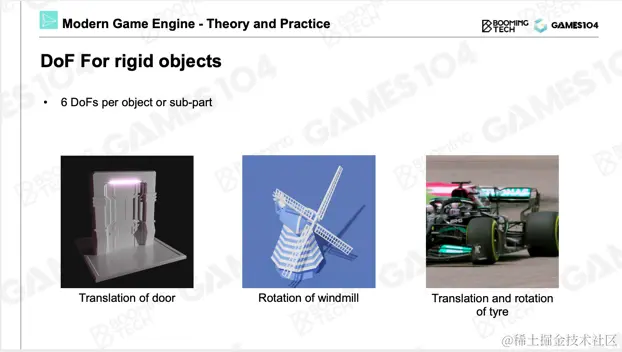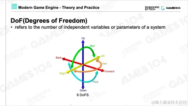 对于一个刚体,其在整个三维空间运动的自由度为6个自由度。因为它有平移的3个自由度,可以沿着x、y、z三个方向去平移,这是3 DoF。刚体还可以沿着三个轴旋转,分别以x、y、z轴为中心进行旋转。所以整个三维空间的刚体,其自由度为6。整个游戏动画的核心是基于自由度的表达,也是对刚体运动的一个表达。
