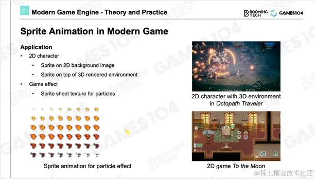 精灵动画这样的技术虽然很古老,但在现代游戏引擎中,即使是高端的3D游戏引擎,这个技术也仍然存在。在游戏的很多系统中,比如像Particle System,后面有一节课会专门讲它。粒子系统中产生的爆炸效果,其爆炸出的每一个粒子不是静态的一张图,实际上是一个序列帧,你可以看到烟球慢慢扩散的效果。所以,精灵动画在2D游戏、特效系统中还是被广泛应用的。