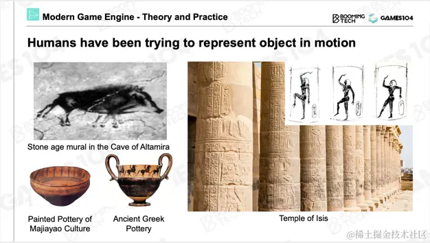 在介绍完渲染系统后,今天将介绍动画系统。相较于渲染系统,动画更加直观,更容易理解。动画也是游戏中最重要的一个系统,所以值得我们不断钻研,发现其中的乐趣。实际上,人类在很早的时代就开始对运动物体充满兴趣,因为我们观察到自然界都是运动的。但人类最早的表达方式只有绘画,所以你可以发现在几万年前,我们先辈画在岩石上的绘画都是动感十足的,包括在先祖的陶器中,你会发现画了一系列人物的动态,而不只是一个静帧。那个时候没有投影技术,但人类先祖脑中想的是一个动起来的世界,所以我们一直在探索这样的一个方法。