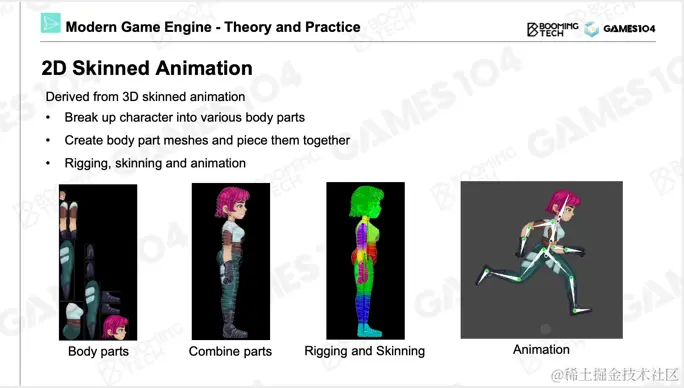 其实蒙皮动画技术在2D动画中也有广泛应用,因为2D动画面临着同样一个问题:如果使用骨骼驱动图片运动,图片间彼此会产生穿插。所有角色看起来就像机器人一样,如果使用同样原理将蒙皮动画的方法运用到2D角色中,当你看到人在运动的时候,整个身体会相对自然地去变形。它们的技术原理是一致的,3D蒙皮动画中的数学运算在2D中也是完全起作用的。