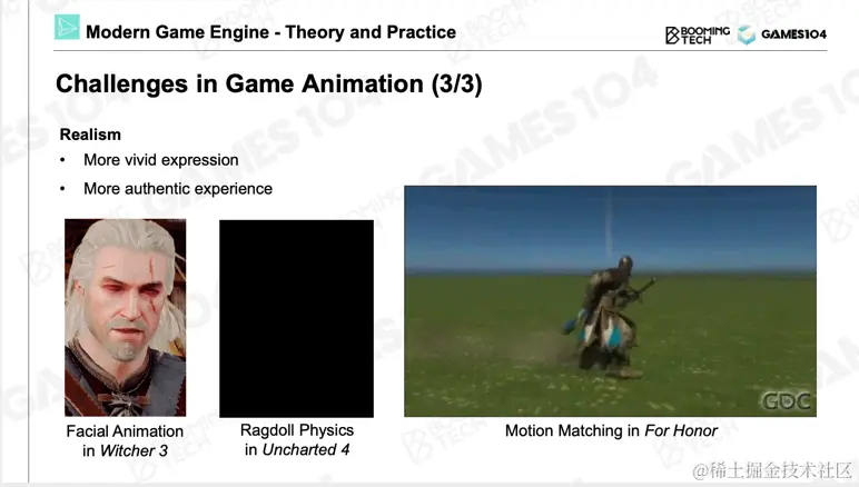 最右边图中展示的是游戏中最火的motion matching技术,它将很多动作融合在一起,使得角色非常鲜活。此外,角色还需要跟环境进行各种符合物理规则的互动,即physic-based animation。当相机距离角色足够靠近的时候,我们可以看到角色的脸,此时会看到人类最敏感的东西——表情。直到现在,表情都是计算机游戏中非常有挑战的部分,想做得很好的话非常困难。我们对真实感也提出了越来越高的要求,因为大家已经习惯于游戏引擎实现的效果能够逼近于电影。而且我们的屏幕越来越大,分辨率从4k变化到8k。未来我们希望能有一个非常high fidelity的虚拟人物站在我们的面前,讲到虚拟人技术的话,其实最核心的就是动画技术。这就是游戏引擎中动画技术的一个核心挑战。