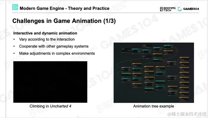 最后会讲两个比较有意思的东西,第一个是怎么去做人面部的动画,你们会发现Facial Animation和普通形体的动画是两套技术体系——两套完全不同的方法论和技术栈。另一个是Animation Retargeting,能否把一个人在走路的动画转移到一个大怪兽上,形成走路的动画。这些技术相对第一节课的技术来讲要难一点,但如果想做一个3A游戏引擎的话,这也属于入门级的一些技术。所以动画两节课会讲一些标准现代游戏引擎里的核心模块,其实还有一些比较前沿的内容,像Motion Matching等,有可能在整个课程上完之后,争取在高级课程中跟大家去讲。大家先在这两节课把动画系统的基础打好,如果将来你想成为一名游戏动画师,或者gameplay的designer,再或者gameplay的programmer,包括你想成为动画方面的专家,这节课的内容与你的相关度非常高。