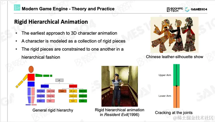 3D游戏动画中最基础的是基于层次结构的刚体动画,它非常像小时候看的皮影戏,把角色的每个关节做成可动的。当移动关节时,整个角色就可以运动起来。实际上,关节本身有一个树状结构,即Hierarchy。刚体动画存在一个问题,当网格模型与骨骼进行绑定时,骨骼发生变动,会导致网格模型彼此穿插。就像小时候看到的皮影戏,它各个关节之间会发生穿插。