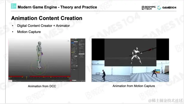 上面主要介绍的是动画系统在Runtime时的方法,另外一个更重要的是Animation Creation,即如何创造动画。传统方法有两种,一种是动画师在编辑器中手K动画,其中的K是指通过Key Frame,即关键帧创作动画。还有一种是Motion Capture,即动捕,动捕技术目前在电影、游戏中已经使用得非常广泛。