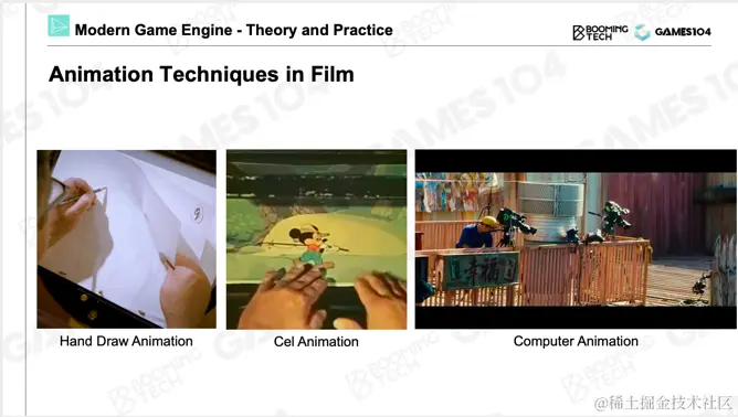 这些动画技术的底层到底是什么呢?从最早的电影开始,制作过程非常简单,通过一帧、一帧的2D手绘,将其绘制出来。后来发展到用摄像机拍摄演员的动作,在演员身上绑定marker,通过光学方法追踪标记点,恢复出人物动作。一些电影中的人物表现得非常真实、自然,实际上是使用了动捕技术。我相信很多同学看电影幕后的时候都能看到动捕技术,动捕技术也是游戏动画的一个核心基础。