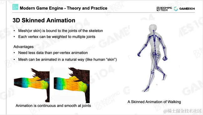 在游戏中出现最多的对象是人、动画角色,人和动物最大的特点是他们表面都有一层皮肤,但它不会随着身体的运动而发生皮肤间的自我穿插。游戏中通常会使用3D蒙皮动画技术实现类似的动画效果,其核心思想是每个顶点受到多根骨骼的影响,这样能够保证当一个对象去运动时,它是水密性的,即皮肤间不会互相穿插。它比早期刚体的骨骼动画做得要好,是现代游戏引擎中最常见的动画模型。