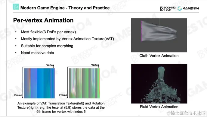 在很多3A游戏中都使用了一种技术——Per-vertex Animation,即顶点动画。如果在游戏中,旗帜类型物体表现得特别好,有可能使用了基于物理的动画或者顶点动画。如果使用骨骼表达风吹布料的效果,需要放置多根骨骼。相比之下可直接存储每个顶点位置随时间的变化,通常会存储两张纹理图:第一张纹理图的横向轴对应着每一个顶点,如果顶点数为100万,横轴也为100万,假设动画是100帧,竖向轴对应着每一帧逐顶点的偏移量。由于顶点发生变化,表面法向也会产生变化,直接使用顶点位置计算法线可能出现问题。从效率的角度出发,将顶点法向信息存储到第二张纹理图中。通常使用物理引擎进行仿真,将顶点动画信息存储到贴图中,在引擎中就能够展现出非常真实的旗帜效果。
