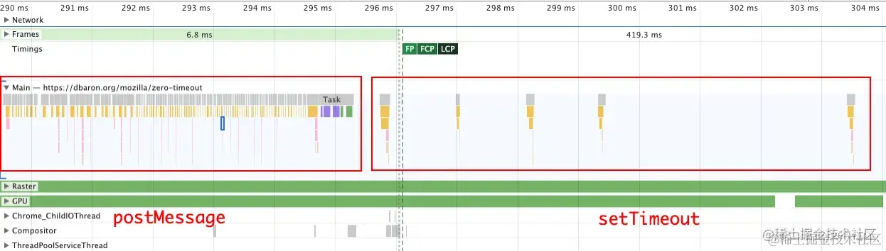 我们打开 Performance 面板,看看更直观的可视化界面中,两个版本的定时器是如何分布的: