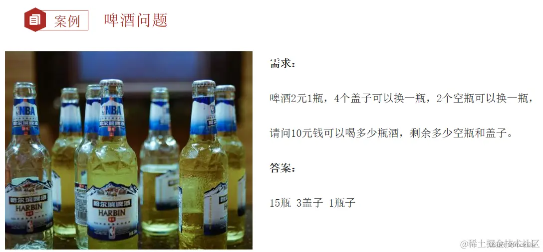 目标:啤酒2元1瓶,4个盖子可以换1瓶,2个空瓶可以换一瓶