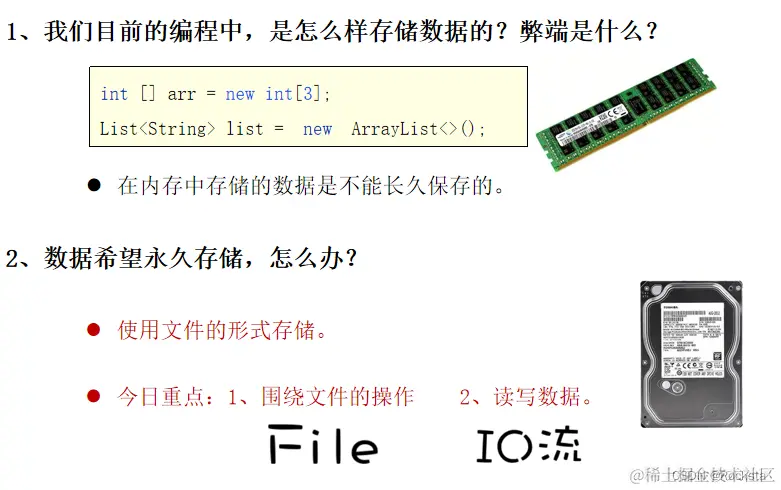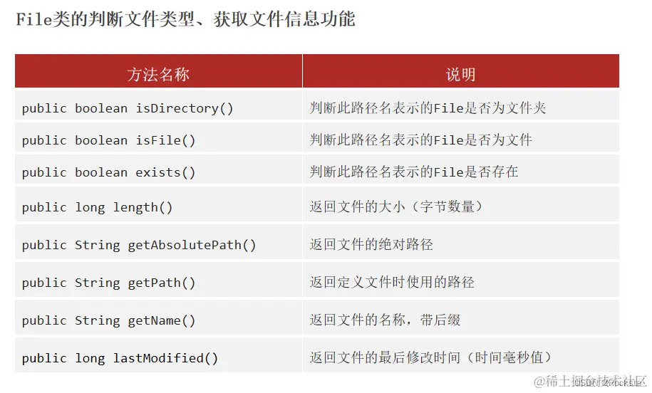 - File类提供了存储:创建文件对象代表文件,获取文件信息(大小、修改时间)、删除文件、创建文件(文件夹)等功能。