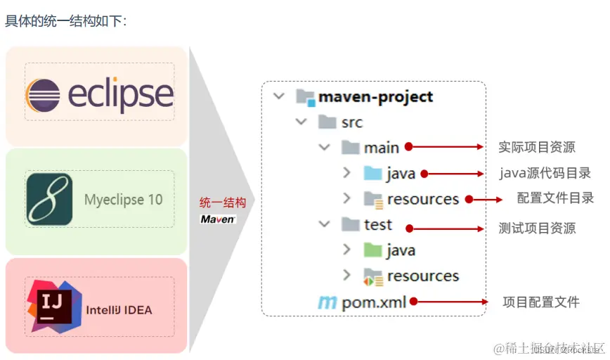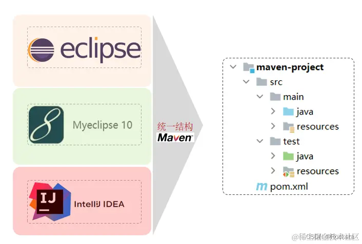 那如果使用了Maven,这一问题将会得到完美的解决,因为Maven给我们提供了一套标准的项目结构,也就是说不管你用哪款开发工具,你只要使用Maven这款项目构建工具,那么生成出来的目录结构都是统一的