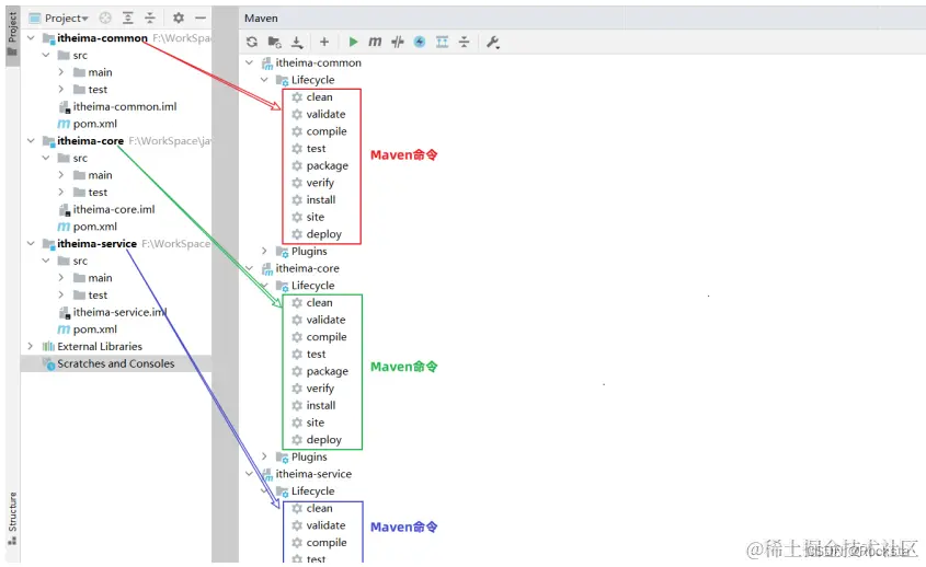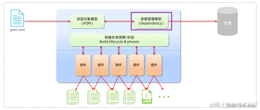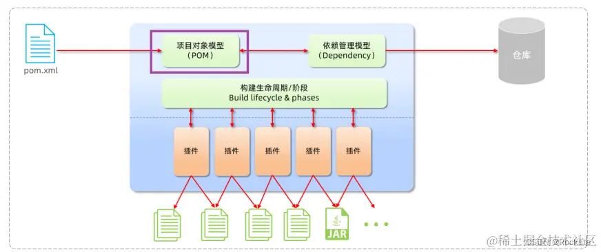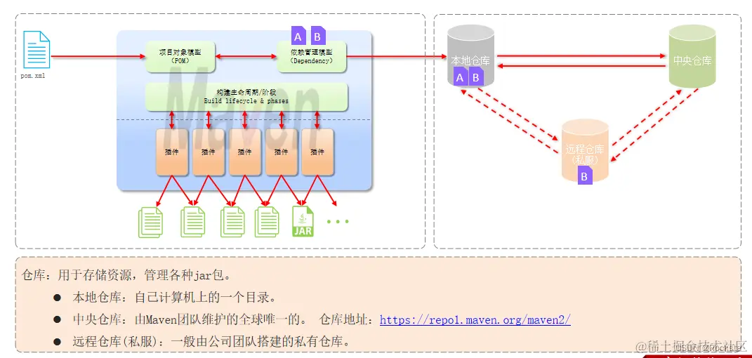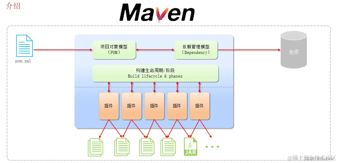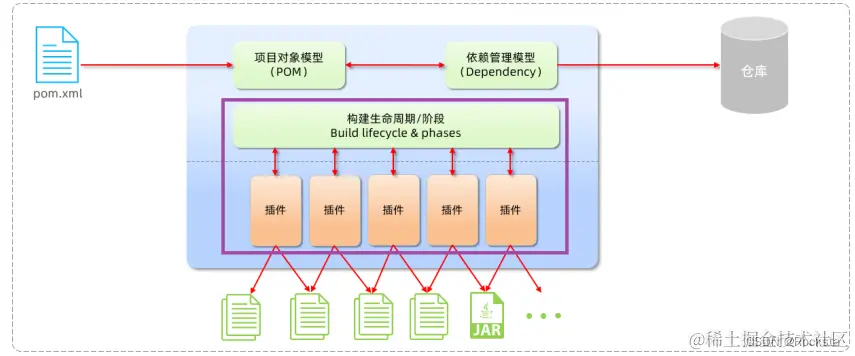 - Maven构建项目生命周期的各个阶段:通过Maven当中提供的各种各样的插件,我们就可以完成对应的功能,比如我们通过编译插件就可以对项目进行编译,通过测试插件进行项目的测试,通过打包插件进行项目的打包等等,通过这些插件就可以完成Maven项目标准化的构建,而在执行这些构建操作的时候,不同的阶段又会有不同的文件产生,比如编译阶段就会有编译后的字节码文件产生,再比如打包阶段就会有打包后的JAR文件产生,这些文件都放放在了target这个目录下,那这是Maven的第一部分,通过提供的各种各样的插件来完成项目的标准化构建。