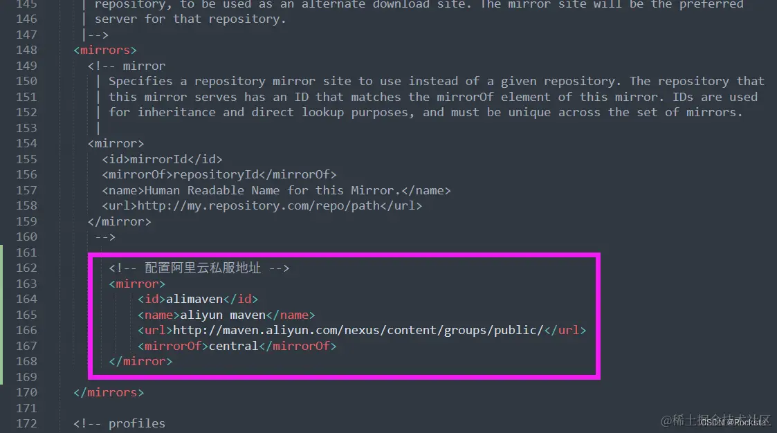 - 配置阿里云私服:修改 conf/settings.xml 中的 <mirrors>标签,为其添加子标签