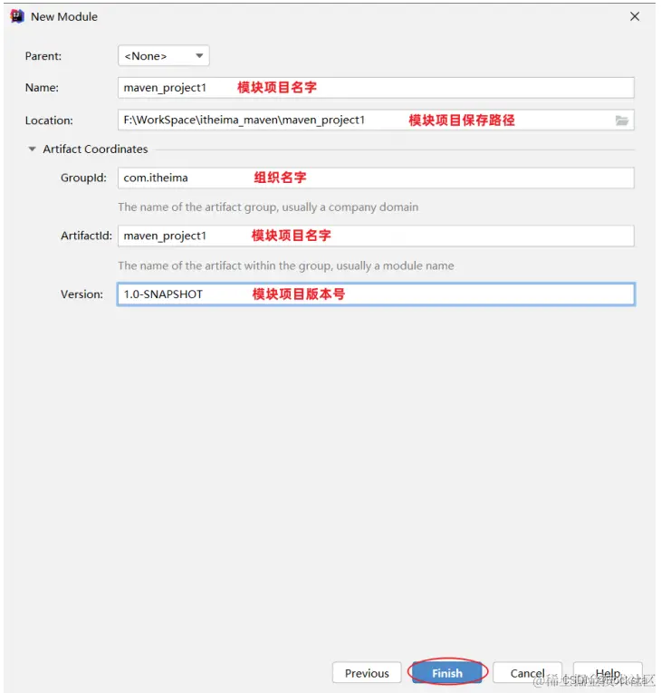 3、填写模块名称,坐标信息,点击finish,创建完成