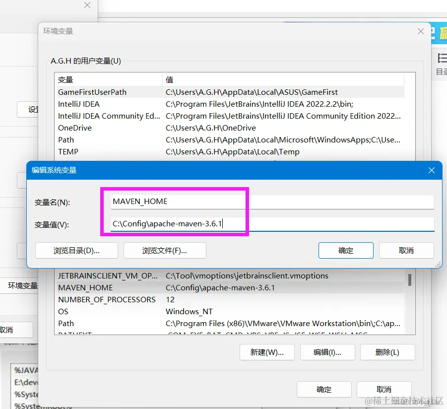- 配置Maven环境变量: MAVEN_HOME 为maven的解压目录,并将其bin目录加入PATH环境变量。