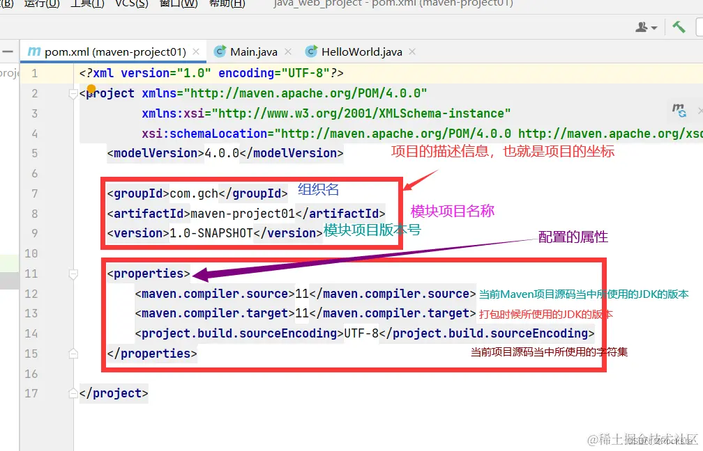 - 以上图中紫色框起来的部分属于项目对象模型,项目对象模型是指在Maven当中可以通过pom.xml当中配置的一小段信息来描述这个Maven工程,就是将我们自己的项目抽象成一个对象模型,有自己专属的坐标,这一块描述信息当中包括当前这个Maven工程归属的组织,当前Maven工程的模块名称以及它的版本,这三项信息我们称之为Maven的坐标,通过这个坐标我们就可以唯一的来标识以及定位一个项目。