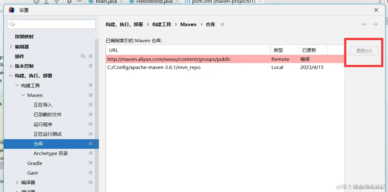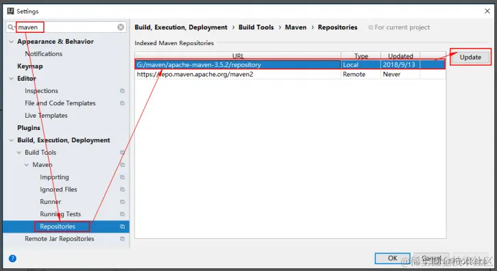 在feile-->settings-->Build,Execution,Deployment-->Build Tools -->Maven-->Repositories****中点击右边的Update更新自己的本地仓库Maven即可