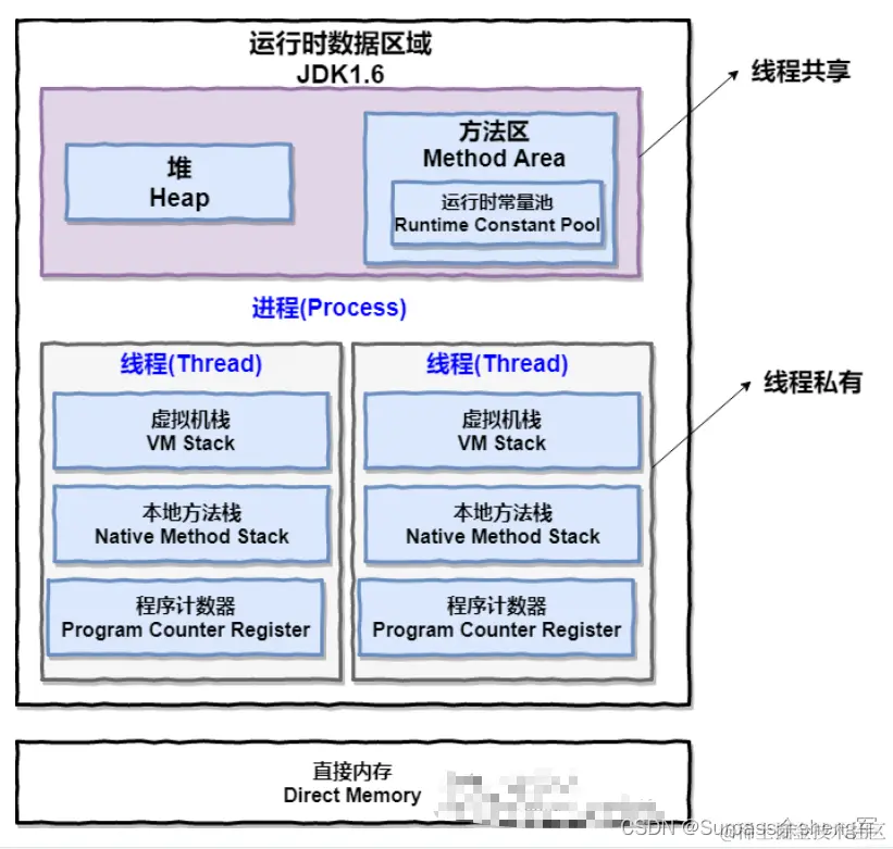 - 栈(Java虚拟机栈 + 本地方法栈)和程序计数器是线程私有的。
